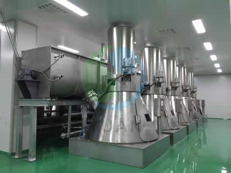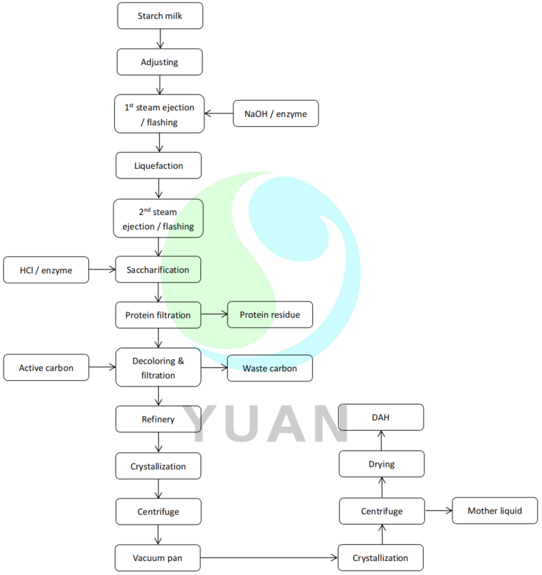 L'amidon commercial est envoyé au réservoir de dissolution et dissous en ajoutant de l'eau. Ensuite, pénètre dans le réservoir de mélange de suspension, par détection et contrôle en ligne, ajustez la valeur DS, le pH et la quantité enzymatique du lait d'amidon, puis pénètre dans le système de liquéfaction automatique. Adoptez deux fois l'éjection, clignotant deux fois, maintenez la température appropriée. et un certain temps, pour assurer le meilleur effet de liquéfaction. Après la liquéfaction, grâce à un ajustement du pH et à l'addition d'enzyme, le sirop est envoyé au système de saccharification. En contrôlant la quantité d'enzyme et du temps de saccharification, la valeur DE ou DX requise par le produit final est atteinte et le sirop pénètre dans le stade de filtration pour éliminer les protéines moins et autres impuretés mélangées dans le produit. Après filtration, le sirop liquide passe par le décoloration, le filtrage et le système d'échange d'ions continu pour éliminer les impuretés colorées et les ions d'impuretés du sirop, afin que le sirop puisse atteindre le but du raffinage et de la purification. Après la concentration par l'évaporateur, le glucose atteint la concentration requise pour la cristallisation et pénètre dans le système de cristallisation. Selon la courbe de refroidissement du système de cristallisation, la température du glucose dans le cristalliseur est automatiquement ajustée. Après avoir maintenu un certain temps, le cristal pénètre dans la centrifugeuse pour la séparation. Après la séparation, la liqueur mère est en outre utilisée en revenant au processus précédent. Le glucose séparé est dissous en ajoutant de l'eau dans le moule à vide de DaH pour l'évaporation et la cristallisation. Ensuite, la Massecuite après un moule à vide est envoyée au cristalliseur et séparée par la centrifugeuse à suspension supérieure. Le cristal de glucose anhydre séparé est envoyé au sèche-linge pour sécher pour obtenir des produits DAH qualifiés.