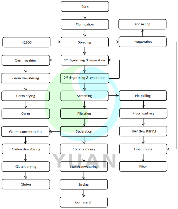 Le maïs brut est déchargé dans la trémie de maïs après la mesure et pénètre dans le tamis rotatif pour éliminer les impuretés à travers le convoyeur et l'ascenseur de seau. Après deux fois, il entre dans le silo de maïs après avoir retiré les impuretés. Le maïs du système de silo entre dans le système de trempage du maïs après le désir et la mesure. Gardez la température de trempage. et la concentration de H2SO3, après avoir trempé pendant un certain temps, il peut être pressé et écrasé à la main, et le germe peut être complètement extrudé, c'est-à-dire que le maïs imprégné qualifié peut être obtenu. Le maïs humide imprégné passe par le dissolvant en pierre dans le 1St DeGerm Mill. Le maïs est divisé en 4-6 gousses. Après le 1St séparation du cyclone germinal, le maïs cassé entre dans le 2nd DeGerm Mill. Le maïs est divisé en 10-12 gousses, puis au 2nd Cyclone germinal pour la séparation. Après la séparation, la suspension diluée passe par le président. Écran d'arc. Le lait d'amidon grossier sous l'écran se mélange avec le lait d'amidon grossier séparé par le moulin à épingles, puis entre dans la section de séparation de l'amidon. Le haut du pré. L'écran d'arc entre dans le moulin à épingles pour le broyage fin pour maximiser l'amidon libre associé à la fibre. Après le broyage du moulin à épingles, la suspension est placée dans le réservoir de lavage des fibres pour un lavage à contre-courant avec des prés. Écran d'arc. Le lait d'amidon grossier est séparé sous l'écran. La fibre est séparée à l'écran ci-dessus, déshydraté par le calcul de la fibre et séchée par le sèche-linge en fibre pour obtenir le produit fini par la fibre.