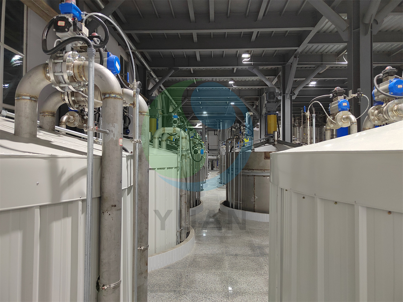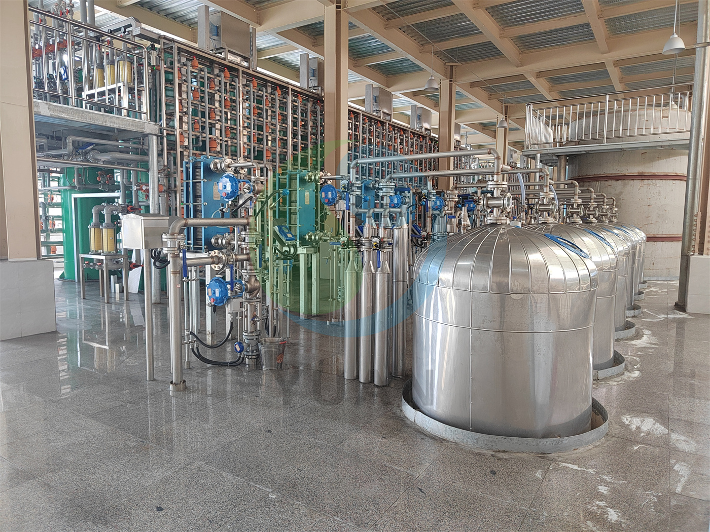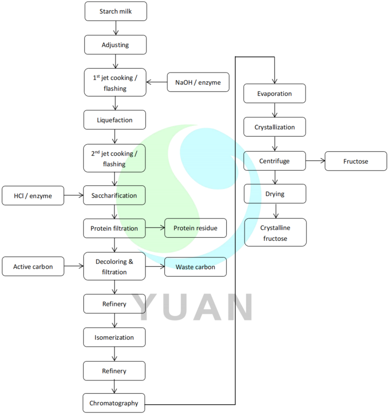 L'amidon commercial est envoyé au réservoir de dissolution et dissous en ajoutant de l'eau. Ensuite, pénètre dans le réservoir de mélange de suspension, par détection et contrôle en ligne, ajustez la valeur DS, le pH et la quantité enzymatique du lait d'amidon, puis pénètre dans le système de liquéfaction automatique. Adoptez deux fois l'éjection, clignotant deux fois, maintenez la température appropriée. et un certain temps, pour assurer le meilleur effet de liquéfaction. Après la liquéfaction, grâce à un ajustement du pH et à l'addition d'enzyme, le sirop est envoyé au système de saccharification. En contrôlant la quantité d'enzyme et du temps de saccharification, la valeur DE ou DX requise par le produit final est atteinte et le glucose pénètre dans le stade de filtration pour éliminer les protéines moins et autres impuretés mélangées dans le produit. Après filtration, le glucose liquide passe par le décoloration, le filtrage et le système d'échange d'ions continu pour éliminer les impuretés colorées et les ions d'impuretés du glucose, afin que le glucose puisse atteindre le but du raffinage et de la purification. Après l'évaporation, le glucose entre dans le système d'isomérisation pour obtenir le fructose 42%. Grâce à la raffinerie et à l'évaporation, F42 entre dans le système de chromatographie pour obtenir le fructose élevé. Après évaporation, le fructose élevé pénètre dans le système de cristallisation. Ensuite, grâce à la séparation centrifuge et au séchage, le produit cristallin qualifié en fructose sera obtenu.