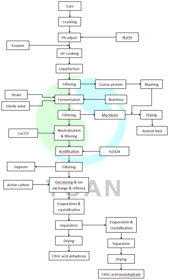 Une fois que le maïs est écrasé par la voie sec, la suspension de maïs pénètre dans le système d'éjection et de liquéfaction. Maintenir la température et la liquéfaction pendant un certain temps, elle pénètre dans la section de filtration. Filtrez la protéine brute, après stérilisation, elle pénètre dans le système de fermentation. Maintenir la température certaine, un certain temps et un oxygène suffisant pour la fermentation. Après filtrage, la purée de fermentation entre dans la section de neutralisation de la production d'acide citrique. Après avoir lavé et récupéré l'acide citrique, le résidu bactérien filtré est mélangé avec la protéine brute liquéfiée pour le séchage comme alimentation animale. Dans la section de neutralisation, adopter deux fois la neutralisation et la filtration, une précipitation de citrate d'hydrogène de calcium est obtenue. Après l'hydrolyse et l'extraction de l'acide, l'acide citrique primaire est obtenu. Grâce à la décoloration, à la filtration et au système d'échange d'ions continues, les impuretés colorées, l'odeur particulière et d'autres ions d'impuretés de sirop sont éliminés, de manière à faire en sorte que l'acide citrique atteigne le but du raffinage et de la purification. Après cela, il entre dans le système de cristallisation d'évaporation sous vide, après la séparation centrifuge, le séchage, l'anhydre d'acide citrique qualifié est obtenu. La maman liqueur provenant de la centrifugeuse passe par le système d'évaporation et de cristallisation sous vide, la séparation centrifuge et le séchage, pour obtenir le monohydrate qualifié d'acide citrique comme produit final.