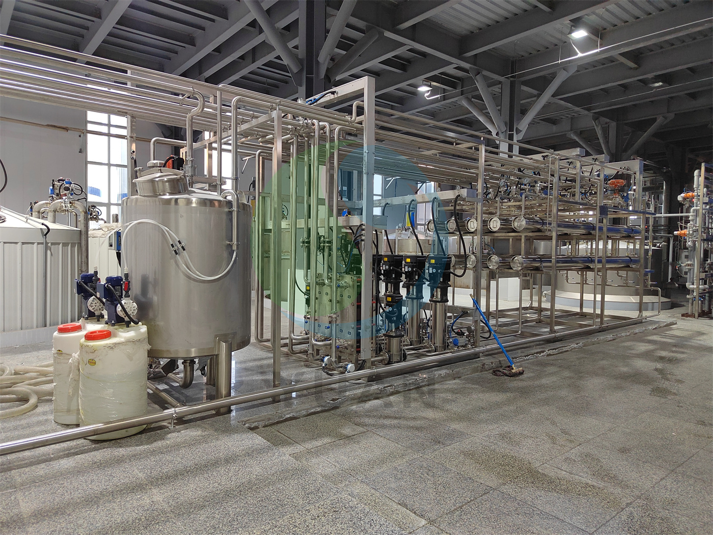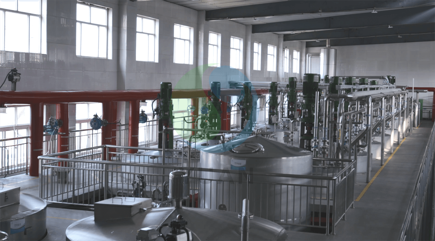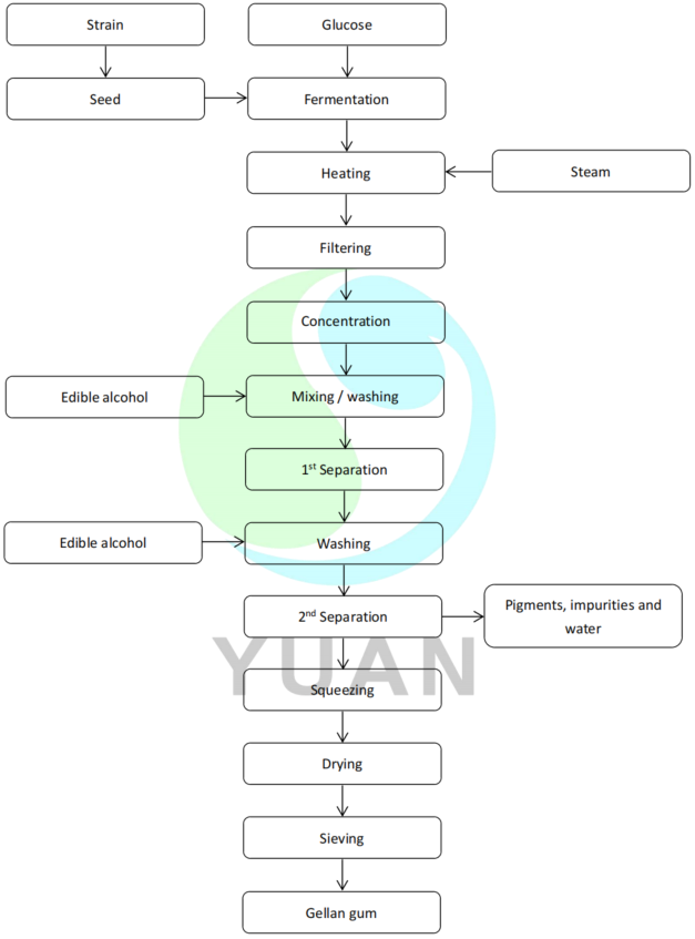 Le glucose qualifié entre dans le système de fermentation pour maintenir un certain temps de fermentation pour obtenir la purée de fermentation qualifiée. Après le chauffage, les bactéries de la purée de fermentation sont inactivées, puis filtrent la protéine de mycélium et les particules insolubles dans la purée de fermentation, il pénètre dans le système de concentration pour la concentration. Une certaine quantité de solvant est ajoutée à la purée de fermentation concentrée et agitée pour la rendre complètement mélangée, de sorte que la fibre est complètement précipitée. Après la séparation et les précipitations, le produit est obtenu. Après le traitement secondaire, la séparation, le pressage et le traitement de la déshydratation, une partie du pigment, des impuretés et de l'eau sont retirées et le produit est séché par le sèche-linge pour obtenir le produit de gomme Gellan qualifié.