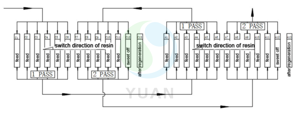 C'est la même chose avec un système d'échange d'ions commun. La résine de notre équipement est remplie de la colonne et elle est régénérée après l'utilisation. Plus important encore, la résine de l'ensemble du système est divisée en plus d'unités pour un fonctionnement plus détaillé. La multi-utilisation du système divise simplement le grand lit de résine fixe en de nombreuses unités gérables qui sont respectivement chargées dans chaque petite colonne de résine.